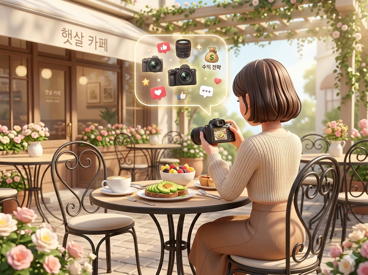 - 이미지 묘사: 화사한 카페 테라스에서 스마트폰과 카메라로 예쁜 브런치 세트를 정성껏 촬영하고 있는 트렌디한 인플루언서의 뒷모습을 담은 감성적인 3D 일러스트