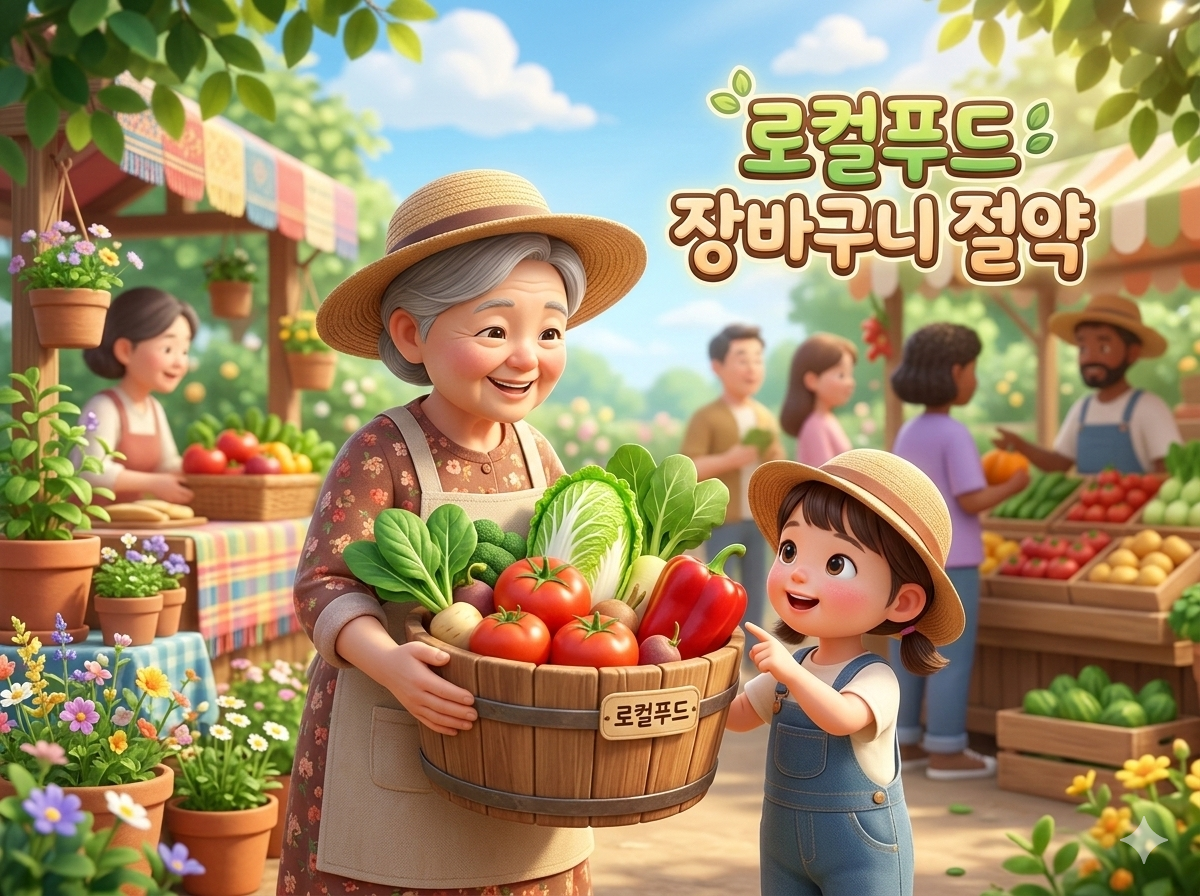 - 이미지 묘사: 햇살 가득한 야외 정원 마켓에서 싱싱한 토마토와 배추가 담긴 나무 바구니를 들고 환하게 웃는 앞치마 입은 할머니와 이를 구경하는 귀여운 아이의 따뜻한 3D 일러스트