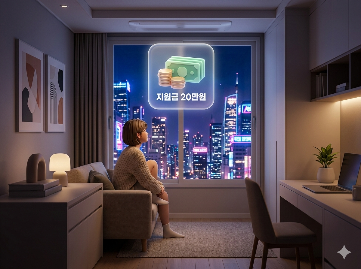 - 이미지 묘사: 세련된 원룸에서 창밖의 도시 야경을 바라보며 미소 짓는 청년, 머리 위로 '지원금 20만원' 아이콘이 떠 있는 감각적인 3D 일러스트 이미지 배치 예정